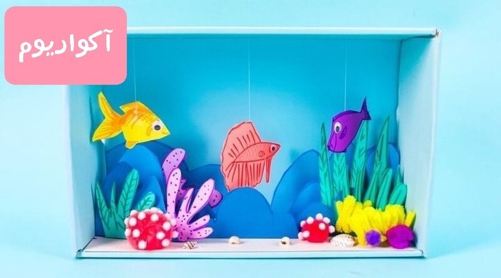 کاردستی آکواریوم🐠 #تقویت_مهارت_دست_ورزی ابزار لازم: جعبه کارتونی مثل جعبه کفش، کاتر و قیچی، نخ، چسب، کاغذ و مقوای رنگی یک سطح جعبه کفش رو مثل شکل می بریم. داخل جعبه رو یا رنگ آبی میزنیم یا با کاغذ رنگی آبی میپوشونیم.📦 با مقوا یا کاغذ رنگی شکل ماهی و موجودات دریایی، گیاهان دریایی، صدف، سنگ و ... درست میکنیم. 🐚🐙🐠 به هر ماهی یا موجود دریایی که میخوایم تو آکواریوم شناور باشه یه نخ به طول دلخواه میچسبونیم و از سقف جعبه آویزون میکنیم. ( در این حالت، ماهی ها ثابت اند. )🧵 (تصویر ۳) اگر میخوایم ماهی ها بتونن در طول آکواریوم حرکت کنن، باید روی سطح بالایی جعبه با کاتر، خطوط طولی ایجاد کنیم. (تصویر ۴ و ۵) و یا اگر میخوایم ماهی ها فقط بالا و پایین برن، روی سطح بالایی جعبه، برای هر ماهی یک سوراخ، ایجاد میکنیم. انتهای نخ هر ماهی رو به یک دکمه یا مهره یا مقوا وصل میکنیم که بتونیم حرکتش بدیم. (تصویر ۶) در نهایت جعبه رو هرجور دوست داریم تزیین میکنیم😍