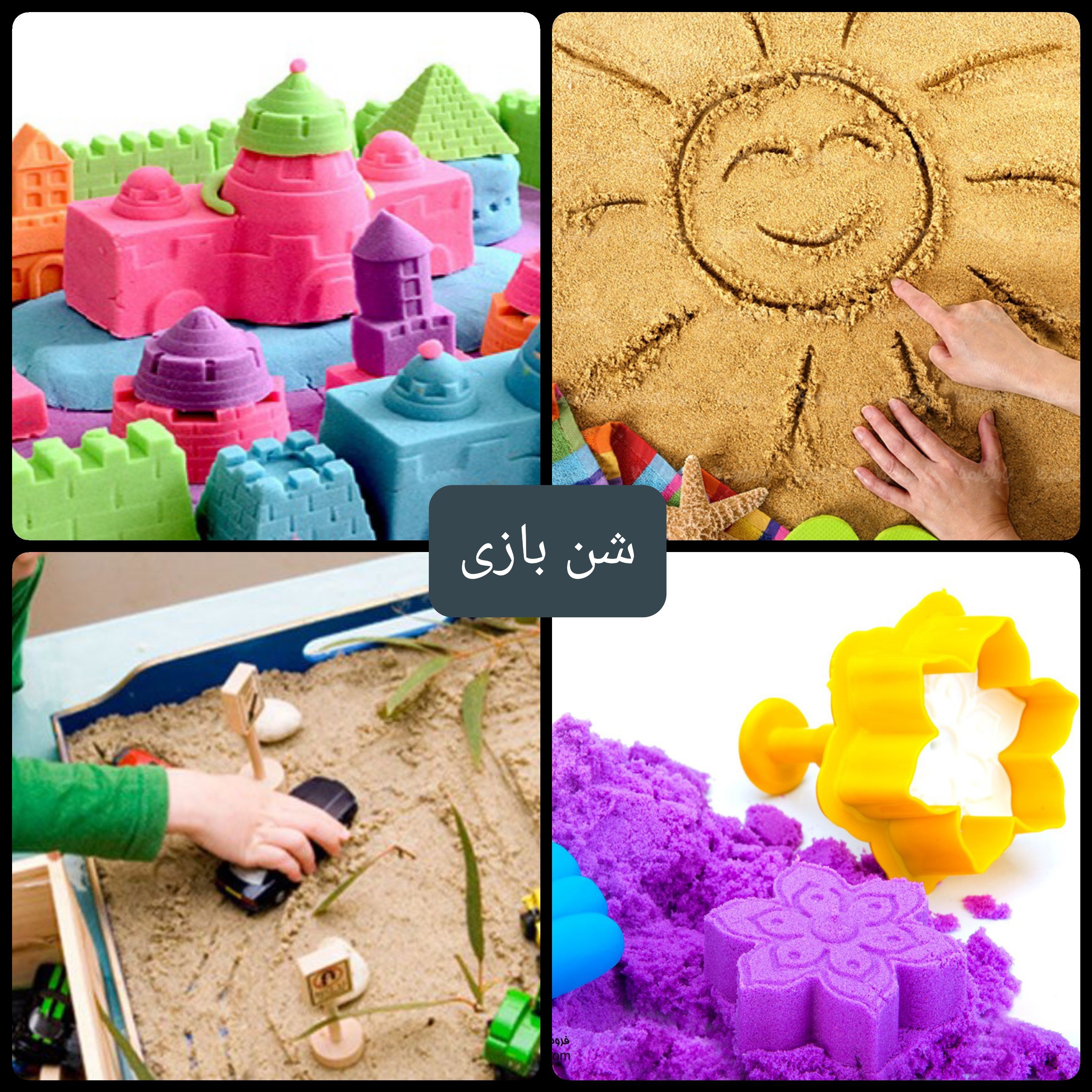 گروه سنی: ۱ سال به بالا #بازی_ابزاری #تقویت_مهارت_دست_ورزی #بازی_حسی ابزار لازم: شن جادویی، نی، قالب، اسباب بازی در سایز و شکل مختلف، الک، قیف، قاشق کوچک، ظروف در سایز های مختلف نحوه بازی: ۱. اجازه میدیم کودک هرچقدر دوست داره با شن آزادانه بازی کنه. با جنسش آشنا بشه، اون رو در مشتش بگیره و خالی کنه و ... ۲. دست یا پای کودک رو زیر شن ها پنهان میکنیم. این کار براشون خیلی جذابه. ۳. از کودک میخوایم روی شن ها هر شکلی رو دوست داره با انگشت یا ابزار نقاشی کنه. مرحله بعد ازش میخوایم شکلی که ما میگیم رو نقاشی کنه. ۴. هر بار روی شن، شکل های مختلف (چهارگوش، سه گوش، دایره، خط منحنی و ...) رو میکشیم و از کودک میخوایم با خلاقیتش با استفاده از اون شکل، نقاشی رو کامل کنه. ۵. اشیا با شکل های مختلف (مثل برگ، صدف، اسباب بازی های مختلف، چنگال و ..) را به کودک میدیم تا اثرشون رو، روی شن ها ببینه. میتونه با استفاده از این اثر ها، نقاشی هم بکنه. ۶. میتونه با کمک قالب های مختلف، سازه های حجم دار بسازه و خراب کنه. ۷. در مرحله بعد تعدادی اسباب بازی یا اشیاء ریز رو زیر شن ها پنهان میکنیم و از کودک میخوایم پیداشون کنه. میشه محدودیت زمانی ایجاد کنیم و بازی رو سرعتی کنیم. ۸. یک نی به کودک میدیم تا با فوت کردن، شن ها رو جابجا کنه و اثر باد رو ببینه. میشه ازش بخوایم سعی کنه با فوت ، شکل خاصی رو روی شن ها ایجاد کنه. ۹. ظرف های مختلف از سایز خیلی کوچک تا متوسط و همچنین الک و قیف و قاشق کوچک در اختیار کودک قرار میدیم. ازش میخوایم شن ها رو از ظرف بزرگ تر به ظرف کوچک تر بریزه. میتونه از ظرف مستقیما داخل ظرف دیگه بریزه یا با قاشق و یا با کمک قیف اینکار رو انجام بده. همینطور کار با الک رو ببینه و تجربه کنه. ۱۰. در نهایت با ساختن سازه ها یا شکل دادن به شن ها و حتی استفاده از حیوانات اسباب بازی مثل شتر و ... میتونیم یه نمایش تخیلی تو یه بیابون یا ساحل دریا اجرا کنیم 😍 ساده ترین روش ساخت شن جادویی خانگی: آرد یک پیمانه، روغن مایع ۳۰ میلی لیتر(یا هر اندازه که قوام شن به نظرتون مناسب بود) ، رنگ خوراکی یا استفاده از رنگ های خونگی که تو ساخت نمک رنگی توضیح دادم. همه مواد رو به هم اضافه میکنیم و با دست ورز میدیم تا گلوله هاش باز بشه. و همین. 😊