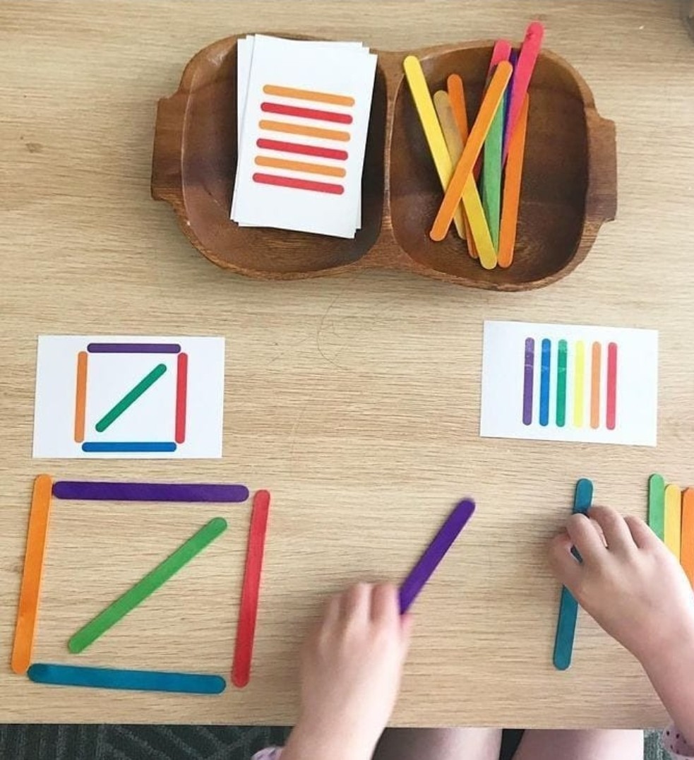 الگویابی #تقویت_هوش #تقویت_تمرکز گروه سنی: ۳ سال به بالا با انواع ابزار ها مثل چوب بستنی های رنگی، مقواهای رنگی، و حتی قاشق و چنگال.. میشه این بازی رو انجام داد. الگوها رو بهشون میدیم و ازشون میخوایم مطابق الگو بازسازی کنن. با افزایش سن، الگوها پیچیده تر و ترکیبی میشن.