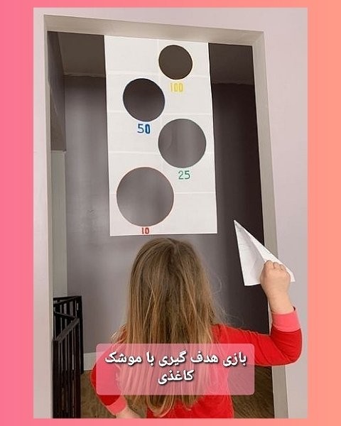 (ورق بزنین) هدف گیری با موشک کاغذی گروه سنی: #۳سال #۴سال #۵سال #۶سال #۷سال #تقویت_تمرکز #تقویت_هماهنگی_چشم_ودست #تقویت_مهارت_حرکتی_درشت ابزار لازم: کاغذ، قیچی (همین😊) میخوایم یه برد هدف گیری درست کنیم. اگر دسترسی دارین یه کاغذ سایز بزرگ مثلا ۵۰ در ۷۰ یا هر سایزی که مایلین بردارین. اگر کاغذ سایز بزرگ ندارین، از چسبوندن چندین کاغذ به هم، درستش کنین. حالا با بشقاب یا در قابلمه در سایزهای مختلف (یا احیانا اگر خیلی مجهزین با پرگار🤪) دایره های با اندازه متفاوت بکشین و ببرین (البته باید اندازه ش به حدی باشه که موشک کاغذی بتونه ازش رد بشه) برای هر دایره، یک امتیاز درنظر بگیرین. هرچی دایره کوچک تر باشه امتیازش بیشتره. (مانند تصویر) حالا برد هدف گیریتون رو از سقف یا چارچوب در یا یه جای بلند آویزون کنین. موشک کاغذی رو هم بسازین. اگر شمام از اون هایی هستین که برد موشک هاتون تا نوک شصت پاتونه، یه نمونه نحوه ساخت رو تو اسلاید دوم براتون گذاشتم😉 حالا زمان بازیه.✈ میتونین یه امتیاز هدف درنظر بگیرین. نوبتی موشک رو پرتاب کنین و از هدف ها عبور بدین. موشک از هر دایره ای رد شد، فرد امتیاز اون دایره رو میبره. و امتیازهاش رو هر دفعه با امتیاز نوبت قبل جمع میکنه. هرکی زودتر به امتیاز نهایی رسید برنده ست. مثلا هرکی زودتر ۱۰۰ امتیاز جمع کرد. میتونین زمان بگیرین. مثلا تو ۱ دقیقه، هرکی امتیاز بیشتری جمع کرد، برنده ست ⏳ دیگه چجوری میشه باهاش بازی کرد؟🤔