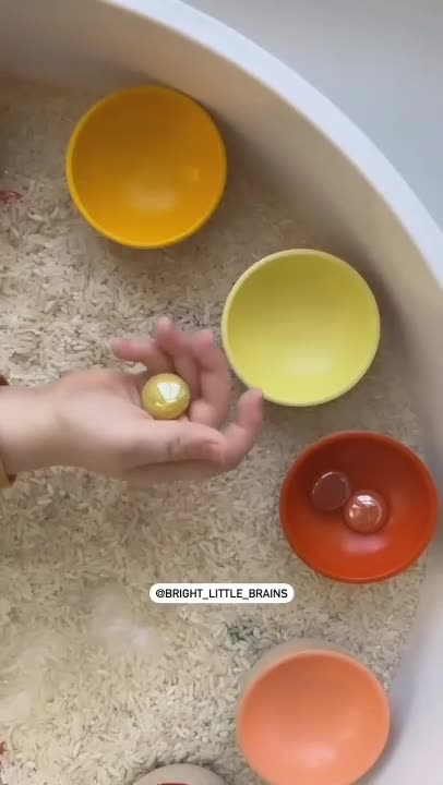 این بازی چند منظوره جذاب رو میتونین با کوچولوهای ۲ سال به بالا انجام بدین. ولی باید در طول بازی مراقب باشین که مهره ها رو تو دهانشون نبرن. ابزار لازم: مهره های رنگی(میشه از دکمه یا پوم پوم های کوچک هم استفاده کرد) ، سینی، برنج، کاسه های رنگی(هم رنگ مهره ها) نحوه بازی: - مهره ها رو زیر برنج ها پنهان کنین و از کودک بخواین اونا رو پیدا کنه و داخل کاسه هم رنگش بندازه. (میتونین انبر کوچک بهشون بدین که با استفاده از اون مهره ها رو بردارن و داخل کاسه بندازن) - برای کوچولوهایی که رنگ ها رو کامل بلد نیستن، تمرین شناخت رنگ هاست. حین بازی ، رنگ ها رو بلند تکرار کنین. - میتونین تمرین شمردن اعداد رو هم انجام بدین و تعداد مهره هایی که تو کاسه ها میریزین رو بشمرین. - میتونین از کوچولوها بخواین که اندفعه اونا مهره ها رو زیر برنج ها قایم کنن. - حتما یه تایم بازی آزاد هم بهشون بدین که هرمدل دوست دارن با خلاقیتشون بازی کنن. #تقویت_حواس #حس_لامسه #شناخت_رنگها #دسته_بندی_رنگها