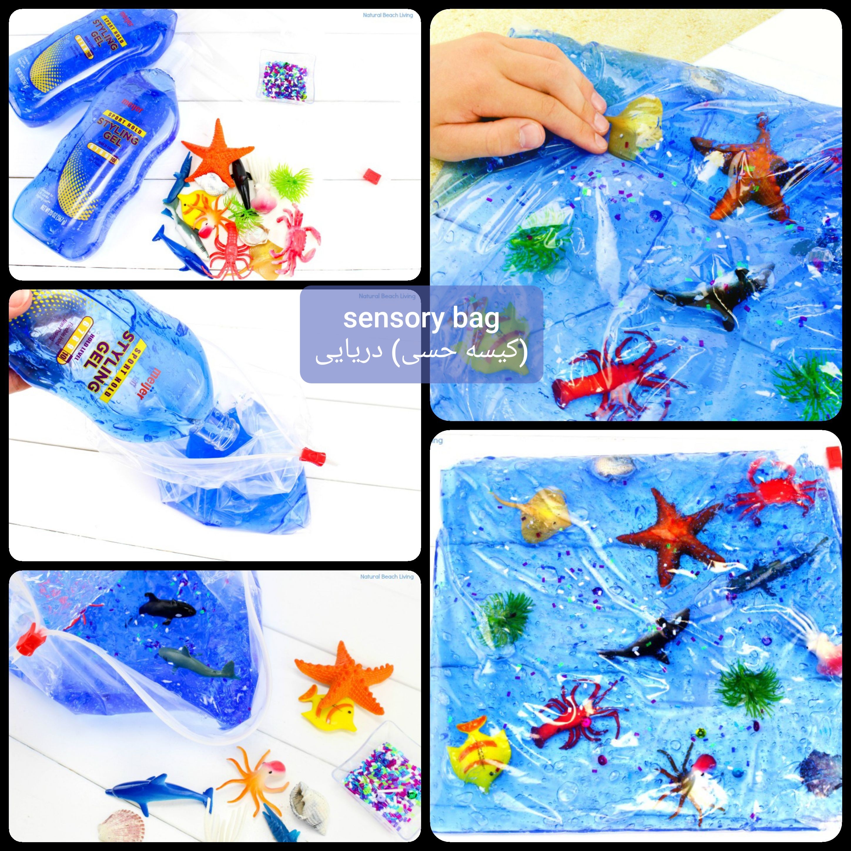 سنسوری بگ (کیسه حسی) دریایی #تقویت_حس_دیداری #تقویت_حس_لامسه #تقویت_کلام #تقویت_مهارت_حرکتی_ظریف در ادامه پست قبل، یه نمونه از سنسوری بگ ها رو باهم ببینیم. ابزار لازم: کیسه زیپ دار، ژل موی آبی رنگ ( اگر نبود میتونیم از شامپو یا مایع ظرفشویی آبی رنگ استفاده کنیم که قوام مشابه دارن. میشه از آب هم استفاده کرد ولی قوام و بافت متفاوتی داره و مدل دیگری از کیسه حسی رو برامون ایجاد میکنه)، موجودات دریایی کوچک، نوار چسب پهن ژل مو رو داخل کیسه میریزیم و موجودات دریایی رو بهش اضافه میکنیم. هوای اضافی رو خارج میکنیم و زیپ کیسه رو میبندیم و با چسب پهن کاملا درزگیری میکنیم. ابتدا اجازه بدیم کودک آزادانه باهاش بازی کنه، با انگشت هاش لمس کنه و موجودات دریایی رو داخل ژل مو حرکت بده. ۲. در مورد موجودات دریایی با کودک صحبت کنیم. اجازه بدیم سوال بپرسه. در مورد رنگشون، غذایی که میخورن، نحوه حرکتشون در آب و ... حرف بزنیم. ۳. از کودک بخوایم موجودات رو دسته بندی کنه، مثلا براساس نوع(ماهی، صدف، گیاهان ..) یا براساس رنگشون، هر دسته رو در یک طرف کیسه جمع کنه. ۴. از کودک بخوایم با اقیانوس و موجوداتش، یک داستان خیالی تعریف و اجرا کنه. و هر بازی که به ذهنتون میرسه....