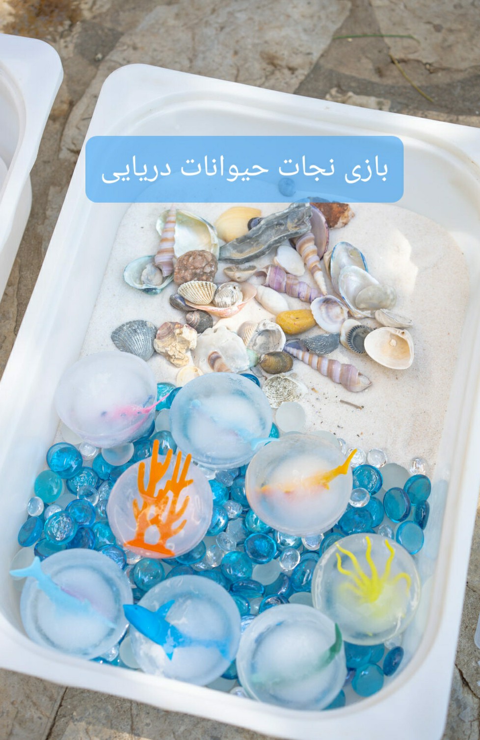 بازی نجات حیوانات دریایی #بازی_حسی #آزمایش #تقویت_کلام حتما این بازی رو با یه داستان هیجان انگیز نجات همراه کنین. اجازه بدین بچه ها هم تو داستان پردازی باهاتون همراهی کنن و از تخیلشون کمک بگیرن. این بازی رو میتونین با هر اسباب بازی کوچکی که دارین انجام بدین. پس اگر اسباب بازی حیوانات ندارین، از وسایلی که دارین استفاده کنین و برای ساختن داستان نجات، خلاقیت به خرج بدین😉 ( مثلا اگر از لگو استفاده میکنین، میتونین بگین تو قطب در اثر یخ بندان مصالح ساختمونی تو یخ ها مدفون شده و ما گروه نجاتیم و باید زودتر پیداشون کنیم تا مردم اونجا بتونن خونه هاشون رو بسازن و گرم بشن و ... ) اسباب بازی ها رو در قالب مناسبشون بچینین و روشون آب بریزین و بذارین تو فریزر یخ بزنه. اگر اسباب بازی ها سبک هستن و روی آب میمونن، ابتدا کمی آب بریزین و بذارین یخ بزنه و دوباره مقداری دیگه بریزین و تو چند مرحله این کار رو انجام بدین تا کاملا داخل یخ قرار بگیرن. حالا یخ ها رو خارج کنین و بسته به داستان پردازیتون از مواد مختلف برای صحنه سازی استفاده کنین( مثل شن، صدف، سنگ های آبی زنگ و ...) ابتدا اجازه بدین بچه ها آزادانه با یخ ها بازی کنن. بعد مقداری نمک، آب گرم و سرد و قطره چکون در اختیار بچه ها قرار بدین. تا به وسیله اون ها یخ ها رو آب کنن و حیوانات رو نجات بدن. فرآیند آب شدن یخ ها رو باهم ببینین و از کودک در مورد مشاهداتش سوال بپرسین😍
