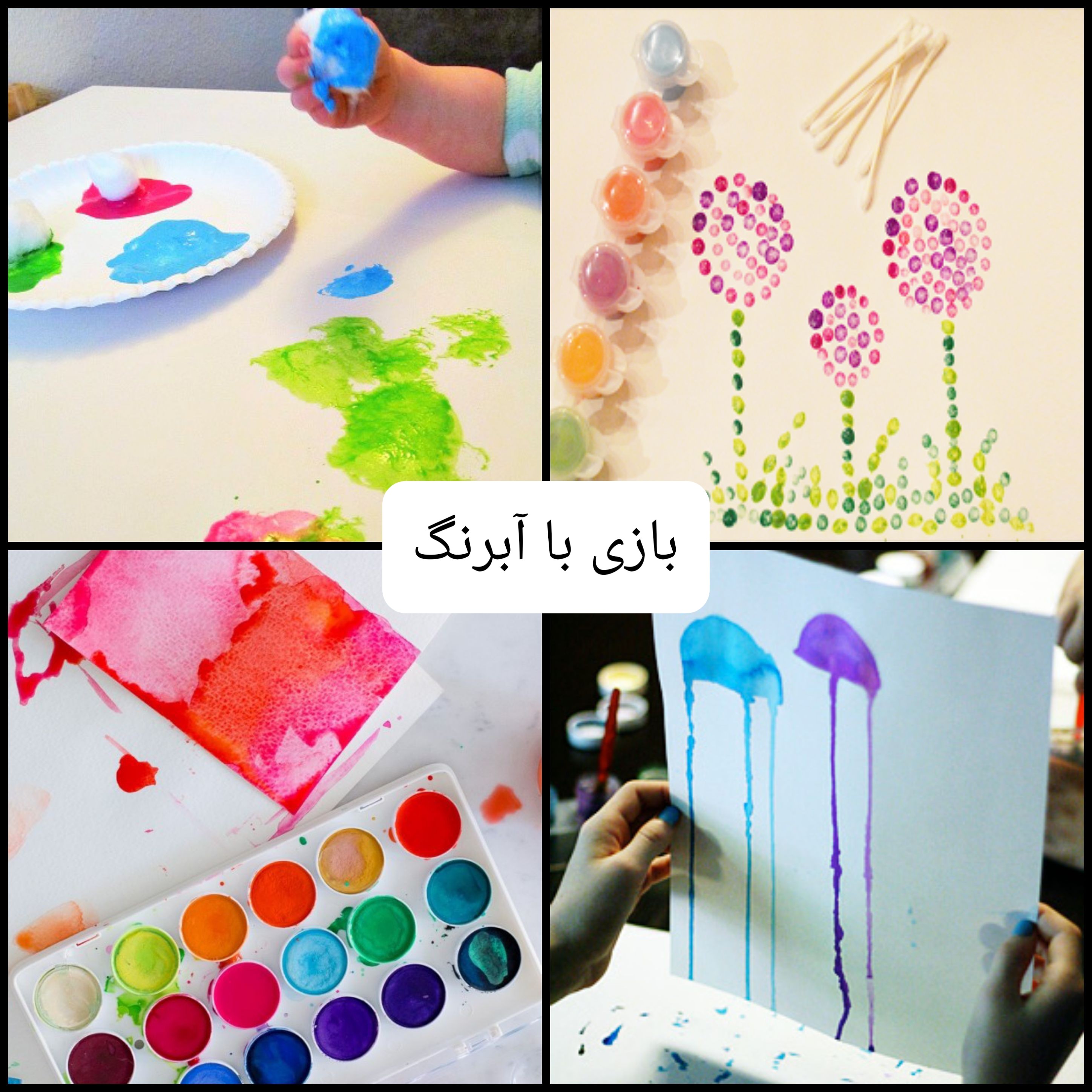 نام بازی: بازی با آبرنگ #بازی_ابزاری گروه سنی: ۲ سال به بالا وسایل لازم: آبرنگ – قلمو – گوش پاک کن –پنبه گردالی – بادکنک کوچک – نی – کوزه – کاغذ سفید مراحل بازی: ۱) توی این بازی میخوایم بچه ها کار با ابرنگ با ابزار مختلف رو تجربه کنند. اول از همه پنبه های گردالی رو به بچه ها میدیم تا اون رو توی آب و بعد آبرنگ بزنند و نقاشی کنند. ۲) حالا گوش پاک کن به بچه ها میدیم تا باهاش نقطه نقطه نقاشی کنند. ۳) یه مرحله جذاب اینه که بادکنک های کوچیک باد شده رو به بچه ها بدیم تا توی آبرنگ بزنند و روی کاغذ فشار بدن. ۴) حالا میشه با بچه ها بگیم که با انگشت شون رنگ کردن رو امتحان کنند. البته اگه تا این مرحله خودشون این کار رو نکرده باشند!!! ۵) حالا هر مادری روی کاغذ سفید یک درخت میکشه، قطره های سبز رنگ آب رو روی شاخه ها میریزیم، مامان ها به بچه ها کمک می کنند تا قطره ها رو با نی فوت کنند تا کمی روی کاعذ کشیده بشه و شبیه برگ های درخت بشه. ۶) آبرنگ قوام زیادی نداره و میتونیم از قابلیت شره کردن و روان شدنش در نقاشی استفاده کنیم و شکل های جدید بسازیم. ۷) در مرحله آخر، یه کوزه با قلمو در اختیار بچه ها میذاریم تا کوزه رو با آبرنگ رنگ آمیزی کنند. توی این بازی بسیار مهمه که ابزار نقاشی کردن رو تک تک و به مرور در اختیار بچه ها بذاریم تا در ابتدا با همه وسایل مواجه نشن و همه ابزار ها را تک تک تجربه کنند.