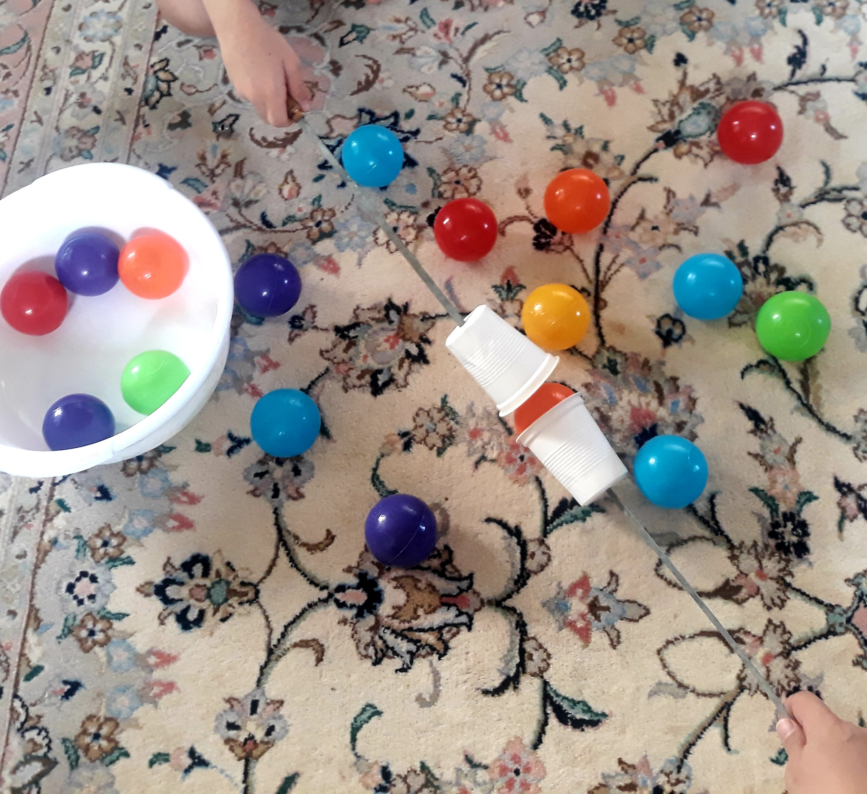 گروه سنی: ۳ سال به بالا #دقت_و_تمرکز #بازی_سرعتی #بازی_دونفره #بازی_گروهی ابزار لازم: توپ رنگی، لیوان یکبارمصرف، سیخ یا چوب یا میله پلاستیکی نحوه بازی: دو کودک باید سعی کنن هماهنگ باهم، توپ ها رو بین لیوان هاشون نگه دارن و به داخل ظرف بندازن. میشه بازی رو به صورت گروهی و در قالب مسابقه بین چند تیم برگزار کرد. این بازی باعث تقویت سرعت عمل در عین تمرکز میشه.