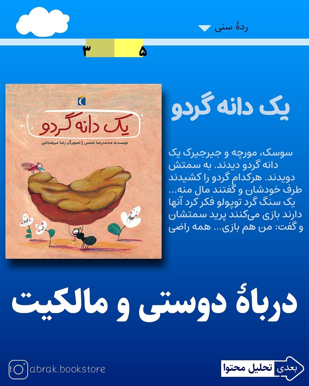 وزش باد باعث افتادن یک گردو از درخت می شود. «سوسک»، «جیرجیرک» و «مورچه» هر سه گردو را دیدند و به سمت آن دویدند. هر کدام از آن ها می خواستند گردو برای خودش باشد که به یک باره سنگ که می خواست با آن ها بازی کند روی گردو افتاد و گردو شکست و چند تکه شد و... . 📕نام کتاب: #یک_دانه_گردو 👫رده سنی: 3تا5 سال 💵قیمت: 8هزارتومان 📩برای تهیه کتاب دایرکت بدهید ✔️به همراه کاربرگ و راهنمای فکرورزی رایگان😍 🔔تحلیل محتوای کتاب را در اسلایدهای داخلی ببینید نویسنده: #محمدرضا_شمس ناشر: #محراب_قلم @abrak.bookstore @abrak.bookstore 🌧️🌧️🌧️🌧️🌧️🌧️🌧️ #کتاب #گردو #کودک #کتاب_کودک #معرفی_کتاب #معرفی_کتاب_کودک #مالکیت #تربیت_اقتصادی #پیشنهاد_کتاب #کتاب_خوب #کتابفروشی #ابرک #کاربرگ #دستورزی #دستنامه #راهنمای_کتاب #یک_گردو #بازی #کتاب_خوب