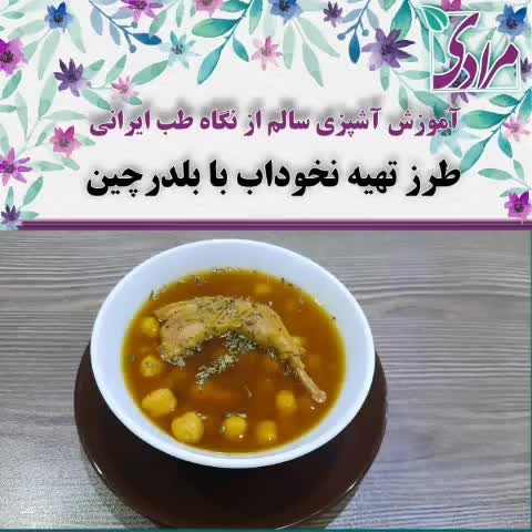 . ___________________________________ 🍲طرز تهیه نخوداب: 🔸️یک لیوان نخود کرمانشاه را بیشتر از 24 ساعت در آب گرم یا ولرم بخیسانید و آب آن را حداقل سه بار عوض کنید. 🔹️سپس با کمی گوشت بلدرچین و آب روی شعله بگذارید. بعد از گرفتن کف آن، یک عدد پیاز بزرگ و زردچوبه و فلفل سیاه اضافه کنید و بگذارید دو ساعت بپزد. 🔸️در یک ساعت آخر پخت، 2 قاشق غذاخوری برنج ایرانی، یک چوب دارچین و 1 قاشق مرباخوری سرخالی زیره و کمی زعفران را اضافه کنید و بگذارید نخوداب جا بیفتد. 🔹️ این غذا را هفته ای دو بار با کمی نان سنگک برشته میل کنید. ❗نکته: نخود خوب، هنگام خیساندن، خیلی زود باد میکند و بزرگ میشود. نخود کرمانشاهی خوب، سه ساعته به خوبی میپزد و نرم میشود؛ در حالیکه بعضی نخودهای دیگر، حتی با ۱۲ ساعت پخت هم کاملا نرم نمیشوند. ‼️مصرف این غذا قبل از اقدام برای بارداری مناسب است؛ ولی مصرف آن، به ویژه در اوایل بارداری توصیه نمی شود. 😋 حالا میریم سر یکسری توضیحات در مورد خواص این غذا: ✅ نخود مزاج گرم و خشک دارد. نخود در دیدگاه طب ایرانی، بهترین حبوبات، برای #تقویت_عمومی بدن و همچنین دوران رشد بچه ها یا افراد لاغر است. چرا که هم غذاییت بالایی دارد و هم، در کبد مواد با کیفیتی (دم صالح) از آن تولید میشود. ✅ نخود مقوی حرارت اصلی بدن است. همچنین باعث نرمی مدفوع میشود. نوشیدن آب، بعد از خوردن نخود، مضر است. ✅ نخود یکی از بهترین موادغذایی برای مشکلات ریه است، مخصوصا اگر با شیر پخته شود. ✅ همچنین در طب ایرانی، انواع غذاهای حاوی نخود، برای #مشکلات_جنسی و #تقویت_باروری زنان و به خصوص آقایان توصیه میشود. یکی از معروفترین این غذاها، #نخودآب است که میتوانید آن را با گوشت یا بدون گوشت طبخ کنید. ✅ نوع بدون گوشت آن، در #رژیمهای_لاغری مخصوصا در افراد با مزاج گرم و تر، نیز کاربرد دارد. ✅ طبخ آن با گوشت، برای بیماران ضعیف، یا افراد چاق با مزاج سرد و تر، توصیه میشود. بدین منظور، بهتر است از گوشتهای لطیفی مانند کبک، بره، مرغ محلی، بلدرچین و ... استفاده کنید. البته اثر گوشت کبک بر افزایش باروری بیشتر از بقیه گوشتهاست. ✅ #رژیم_نخوداب، در رژیمهای #پاکسازی_بلغم نیز کاربرد زیادی دارد. بدین منظور، موثرترین روش این است که شما ۴ تا ۱۱ روز، فقط همین غذا را میل کنید. 👈🏻 ادامه خواص این غذای خوشمزه در کامنت 😊 #نخودآب_مرادی #آشپزی_سالم_مرادی #آشپزی_سالم_از_نگاه_طب_ایرانی #دکتر_فاطمه_مرادی #متخصص_طب_ایرانی