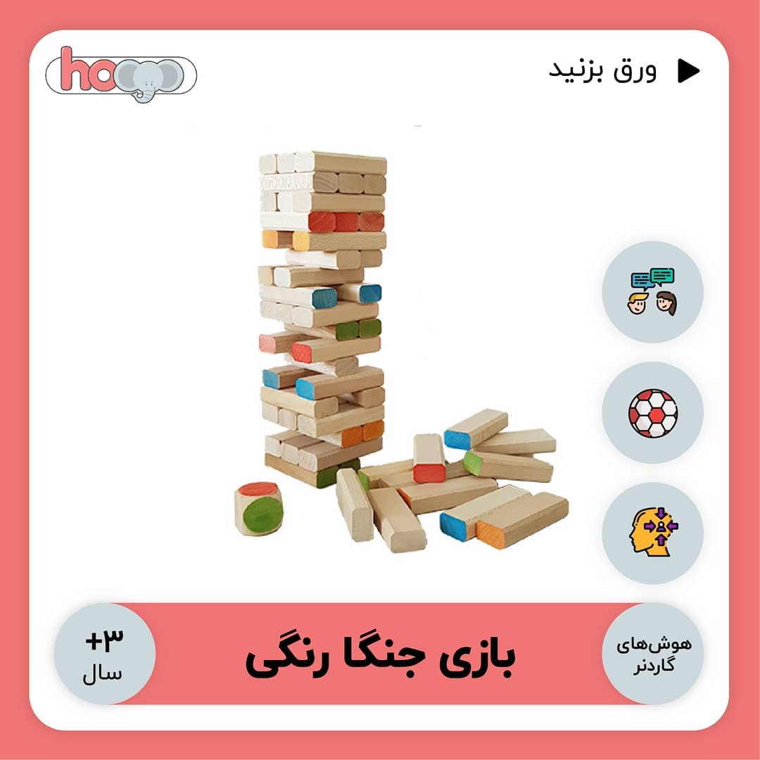 . اطلاعات محصول: نام: اسباب بازی جنگا رنگی گروه سنی : ۳+ سال تاثیرات آموزشی: - تقویت هوش درون فردی - تقویت هوش هوش حرکتی-جنبشی - تقویت هوش بین فردی قیمت: ۱۶۹,۰۰۰ تومن کد تخفیف: دایرکت ابعاد: ۸ در ۸ در ۳۶ سانتی متر تعداد قطعات: ۵۴ قطعه جنس اسباب بازی: چوب . . . . . . . #بازی_گروهی #بازی_رومیزی #جنگا #برج_هیجان #هیجان #پرهیجان #سرگرمی #تخفیف #تولیدملی