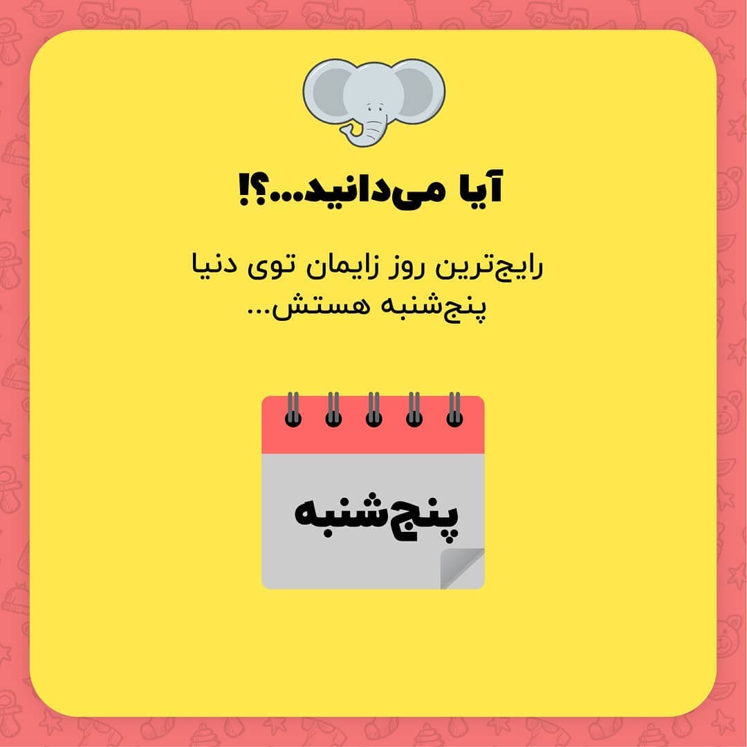 . مامانی باردار رو منشن کنین... . تحقیقات آماری نشون داده که بیشترین تعداد زایمان توی دنیا، مربوط به آخر هفتس (البته منظورم هفته خودمونه) و پنجشنبهها تعداد زایمانهای طبیعی نسبت به بقیه روزهای هفته بیشتره. . . . . . . . . #جالب #دانستنی #علمی #عجیب #باحال #دانستنی #دانستنیها #نوزادپسر #نوزاددختر #بچه_ناز #نوزاد #نینی #کودکی #نینی_ناز #بارداری #زایمان