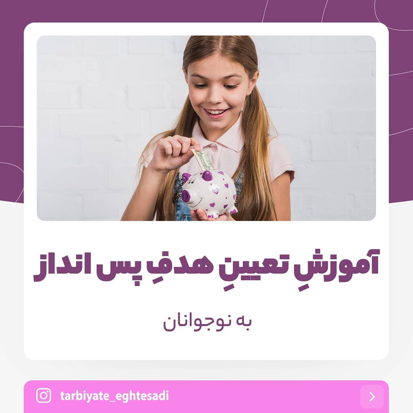 . 💜 به نام خدا 💜. . 🟣 تو این پست نکاتی رو گفتم درباره ی تعیین هدف پس انداز برای نوجوون ها که البته به درد بزرگترها هم میخوره. . 🟣 اگر کسی نوجوون داره یا معلم و مربی هست یا فکر میکنید براش مفیده ، حتما براش ارسال کنید این پست رو. . . ~~~~~~~~~~~~~~~~~~~~~~~~. . @tarbiyate_eghtesadi. @paighami. . ~~~~~~~~~~~~~~~~~~~~~~~~. . #تربیت_اقتصادی . #هدف#نوجوان#نوجوانان#اقتصاد#تربیت. #دکتر_عادل_پیغامی#سواد_مالی. #پسانداز#پسانداز_کردن_پول . #پساندازکنید #پس_انداز. #پس_انداز_را_بیاموزیم . #سواد_مالی_و_اقتصادی . #سواد_مالی_نوجوان . #سواد_مالی_کودکان . #سواد_مالی_نوجوانان . #پس_انداز_پول_توجیبی. #الهه_ریوندی.