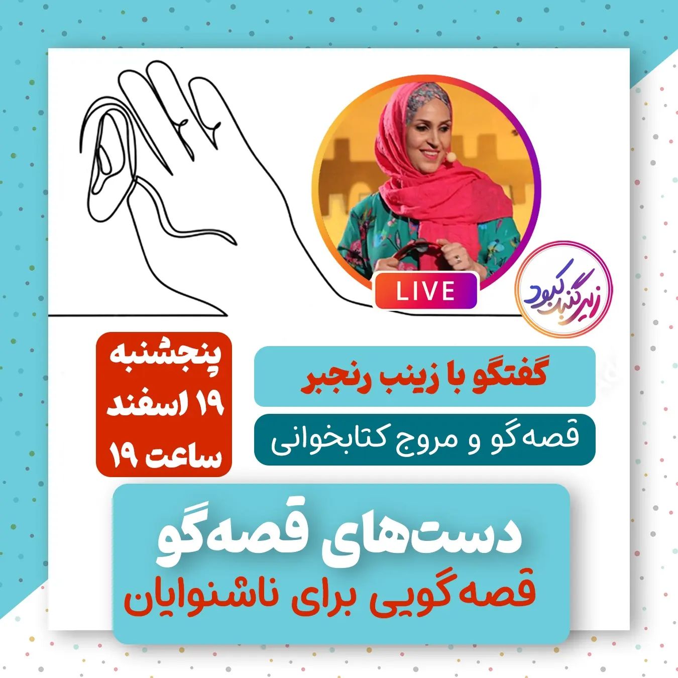 قصهها با صدا و آوا و کلمات به دنیای کودکان راه پیدا میکنند اما بچههایی هستند که دریچه ورود قصهها برایشان اشارات دست و حرکات انگشت و زبان بدن است. بچههای ناشنوا هم حق دارند به سرزمین قصهها سفر کنند. 🔻خانم زینب رنجبر، قصهگو و مروج کتاب کودک است که با زبان اشاره برای کودکان ناشنوا قصه اجرا میکند. 🧐زیر گنبد کنجکاو شد که چه اتفاقی باعث شده خانم رنجبر به این کودکان توجه کند؟ 🤔چگونه زبان اشاره را یاد گرفت؟ 🔻مشکلات و فرصتهای قصهگویی با زبان اشاره چیست؟ 🔻چگونه کتاب و داستان برای این کار آماده میکند؟ و سوالهای دیگر. ⏰پنجشنبه با ما همراه باشید ساعت ۱۹ 📣به دوستان خود اطلاع دهید 👁️🗨️لایو از صفحه زیرگنبدکبود پخش میشود @ziregonbad @ziregonbad #زیرگنبد #زینب_رنجبر #ناشنوا #ناشنوایان #قصه #قصه_گویی #داستان #کودک #کودک_ناشنوا #فرزندناشنوا #فرزندپروری