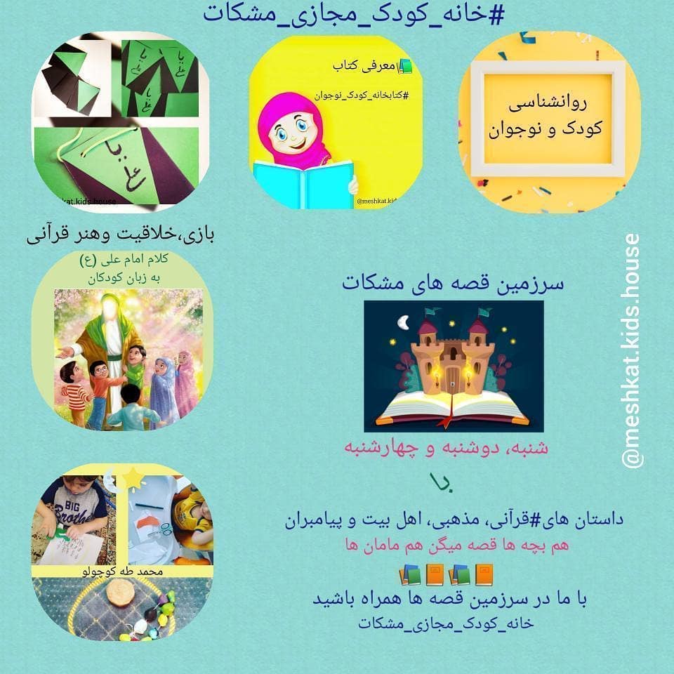 #خانه_کودک_مجازی_مشکات یه تیم مادرانه ی خلاق و روانشناس ومتخصص در حوزه کودک و نوجوان هست؛که برنامه های قصه گویی(روزهای زوج)، روانشناسی و فعالیت های خلاقانشون همه بر اساس آموزه های دینی و قرآنیه میتونید برنامه هاشون رو دنبال کنید. @meshkat.kids.house