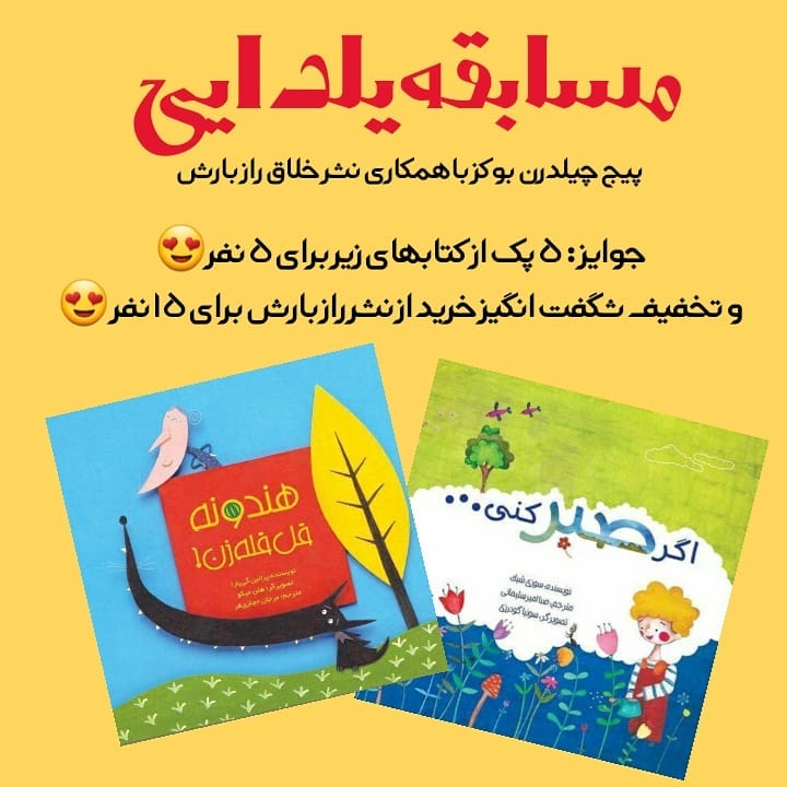 برای شرکت در مسابقه کپشن را مطالعه کنید👇 مسابقه داریم مساااابقههههه 😊😍 به خودم گفتم مگه فالوورای من چشونه که نباید برنده هدیه های یلدایی باشن!😁 خوب برای شرکت در مسابقه این کارارو بکنید: ۱- پیجهای زیر رو حتمااااا فالو داشته باشین @childrenbooks_plus @raze_baresh @webooks_ir ۲- هرچقدر میتونین زیر این پست کامنت بزارین(هرچی کامنت بیشتر شانس برنده شدن بیشتر) میتونین دوستانتون رو تگ کنید مثلا ۳- این پست رو استوری کنید و پیج هایی که بالا عنوان شده رو تگ کنید(اگر پیجتون بستس اسکرین شات بگیرین از استوریتون برام بفرستید) تموم شد به همین راحتی 🥰 ۲۴ ساعت دیگه قرعه کشی برنده هارو انجام میدیم. ببینم چیکار میکنیداااااا🌷 میخوام تند تند براتون مسابقه بزارم 😊