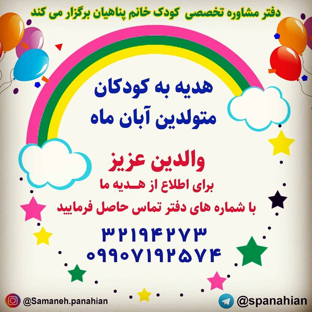 اعتبار هدیه تا ۲۹ آبان🤗 🥰مادرانی که کودکان متولد آبان ماهی دارند را می توانید زیر این پست تک کنید👌 💟هر مادری که کودک متولد آبان ماهی دارد می تواند از هدیه ما استفاده کند💕 ☎️09907192574 32194273 @samaneh.panahian #دفتر-مشاوره-تخصصی-کودک-دکتر_سمانه_پناهیان #روانشناس_کودک #اولین_برگزارکننده_کارگاههای_تخصصی_مادروکودک_در_استان_مازندران #دارنده_مجوز_رسمی_از_سازمان_نظام_روانشناسی_و_مشاوره_کشور