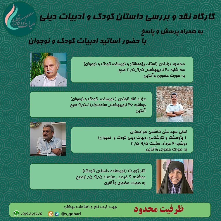 *کارگاه نقد و بررسی داستان کودک و ادبیات دینی* به همراه پرسش و پاسخ *با حضور اساتید ادبیات کودک و نوجوان* ✅جناب آقای برابادی ( استاد، پژوهشگر و نویسنده کودک و نوجوان) - به صورت آنلاین و حضوری ✅ جناب آقای عزت الله الوندی (نویسنده کودک و نوجوان) - به صورت آنلاین ✅جناب آقای سید علی کاشفی خوانساری ( پژوهشگر و کارشناس ادبیات دینی کودک و نوجوان) - به صورت آنلاین و حضوری ✅سرکار خانم کلر ژوبرت( نویسنده داستان کودک) - به صورت آنلاین و حضوری برای اطلاع از زمان برگزاری هر جلسه به بنر مراجعه فرمایید🌸 📣برای ثبت نام فقط از طریق پیامرسانها اقدام نمایید. 09190161204 @S_gohari صفحه ما در پیامرسان بله و ایتا👇 https://ble.ir/ghatre97 Eitaa.com/ghatre97 صفحه ما در پیامرسان واتس آپ👇 https://chat.whatsapp.com/KQWKESxC1Do2bldtoCqSSR https://chat.whatsapp.com/F6Us8zp8l9KBWnwHYFxPki