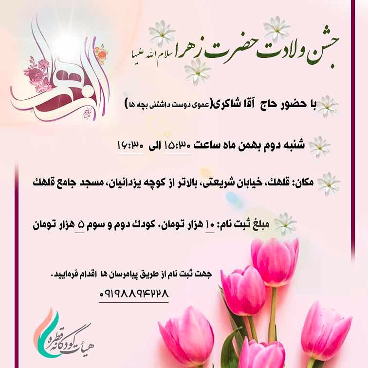 🎊 *جشن ولادت حضرت زهرا سلام الله علیها* 🎊 با حضور عموی دوست داشتنی بچه ها *حاج آقا شاکری* شنبه دوم بهمن ماه👏 ساعت ۱۵:۳۰ الی ۱۶:۳۰😃 مبلغ ثبت نام ۱۰ هزار تومان ، کودک دوم و سوم ۵ هزار تومان👌 جهت ثبت نام از طریق پیامرسانها اقدام نمایید. 09198894228 #جشن_میلاد_حضرت_زهرا #هیئت_کودکانه_قطره #روز_مادر#جشن_روز_مادر