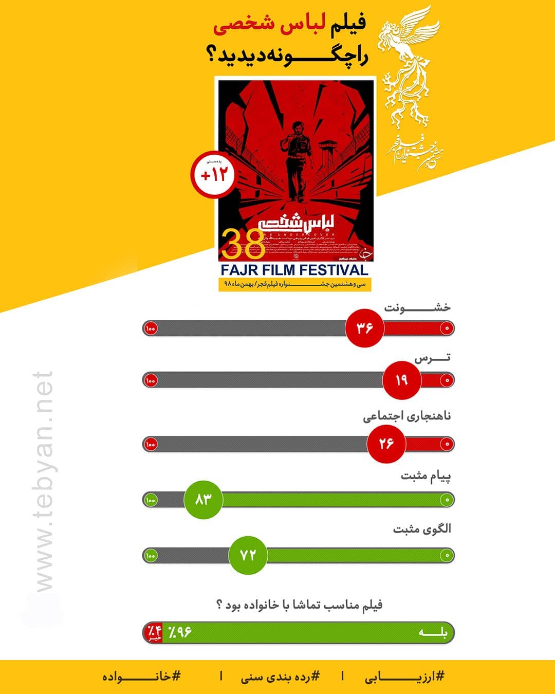 نظرسنجی کدومو از تماشاگران "لباس شخصی" 📊خشونت : ۳۶ 📊ترس :۱۹ 📊ناهنجاریهای اجتماعی : ۲۶ 📊پیام مثبت : ۸۳ 📊الگوی مثبت : ۷۲ ۹۶ درصد تماشاگران این فیلم را مناسب تماشا با خانواده دانسته اند. نظر شما درباره این فیلم چیست❓ #لباس_شخصی #جشنواره_فیلم_فجر #فیلم_فجر #کدومو 🆔 @KODOUMO