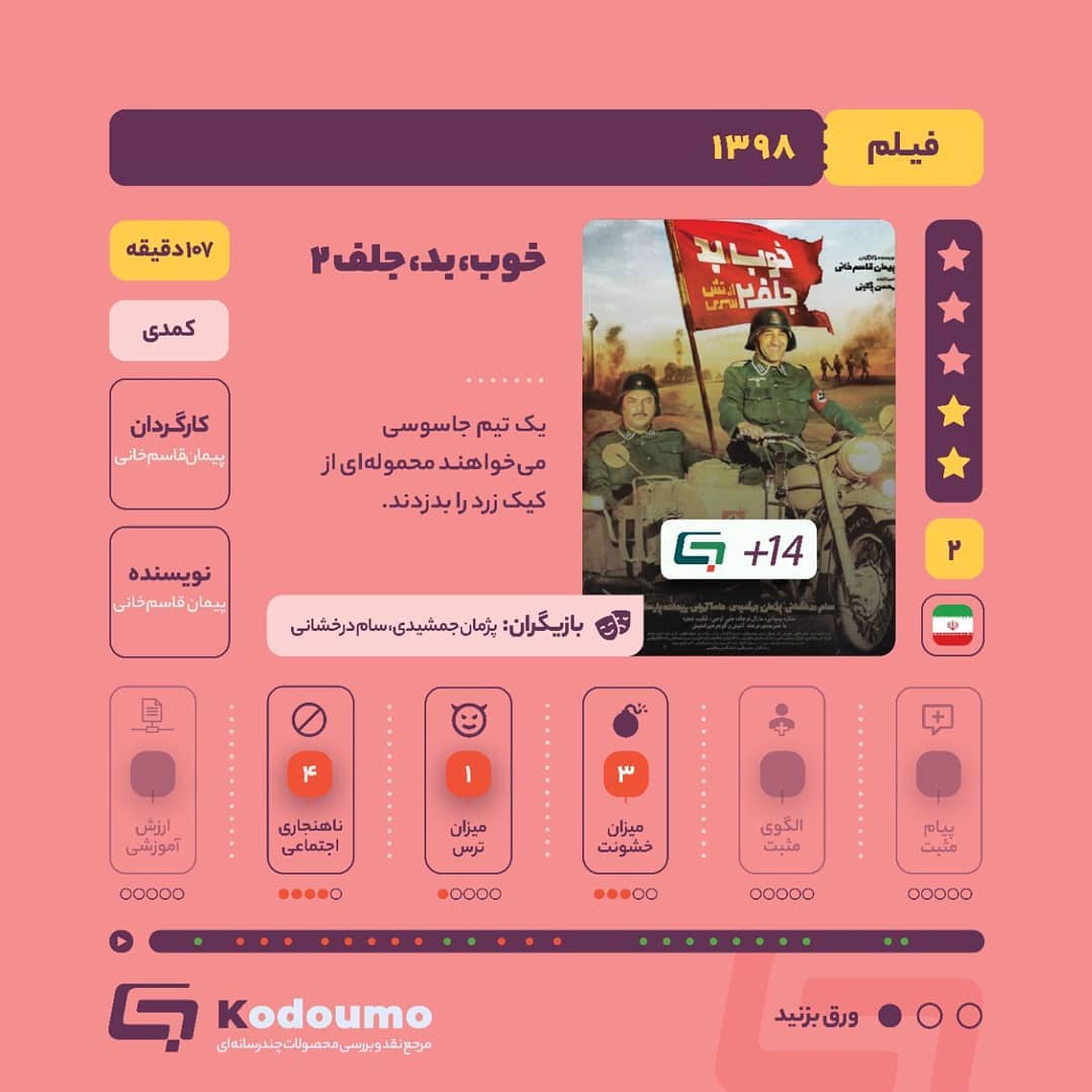 🎥 فیلم سینمایی خوب بد جلف ۲ (ارتش سری) 🎞 کمدی محصول ۱۳۹۸ ایران 📽 کارگردان : پیمان قاسم خانی 📄خلاصه داستان: سام درخشانی و پژمان جمشیدی قرار است در فیلمی بازی کنند که سرمایهگذاران آن از آمریکا آمدهاند تا با پوشش این فیلمسازی عملیات خرابکارانهای را در ایران انجام دهند. این عملیات دچار حوادثی میشود و در نهایت داستان بدون پایان تمام میشود تا در قسمتی دیگر ادامه پیدا کند. 🔞رده بندی سنی +۱۲ . ⚠️خشونت 🔴🔴🔴🔴⚪ (۴ از ۵) . 🔺سام و پژمان در این فیلم تحقیر و تمسخر میشوند. زنان بعضا از برقراری مکالمه با سام و پژمان دلگیر، ناراحت یا عصبانی هستند. در این امر نگاههای مردان به زنان میتواند حساسیتبرانگیز باشد. همچنین صحنههایی از تیراندازیهای مداوم همراه با نمایش خون در فیلم وجود دارد. صحنههای خشونت آمیز همواره با طنز همراه است. . ⚠️ناهنجاری اجتماعی 🔴🔴🔴🔴⚪ (۴ از ۵) ⛔ چند نوع ناهنجاری اجتماعی میتواند وجود داشته باشد⁉️من به شما اطمینان میدهم که همه نوع از ناهنجاری را میتوانید در این فیلم پیدا کنید . 💡آنچه لازم است والدین بدانند: والدین عزیز! من نمیدانم شما دقیقا نگرانی تان برای آنچه فرزندان دل بندتان میبینند چیست، اما شاید ذکر چند نکته برای شما راهگشا باشد؛ اگر دروغ گویی یا حتی تمسخر و سخن چینی (آن چیزهایی که «پرخاشگری ارتباطی» نام گرفته) دغدغه ی اصلی شماست، به نظر میرسد این فیلم برای فرزندتان اصلا مناسب نیست. دروغگویی و مسخره کردن در این فیلم امری عادی است. شما حتما می دانید کودکان شما تا چه حد از مسائل جنسی سر در می آورند (اگر نمی دانید به نظر میرسد که باید با آنها در این باره گفتگو کنید، حتی اگر این گفتگو سخت باید)ُ، این فیلم پر است از نگاه ها و گفتارهای جنسی. مراقب باشید! #خوب_بد_جلف #نقد #ارزشیابی #کدومو #فیلم #آموزش #تربیت #فیلم_فجر #جشنواره_فیلم_فجر