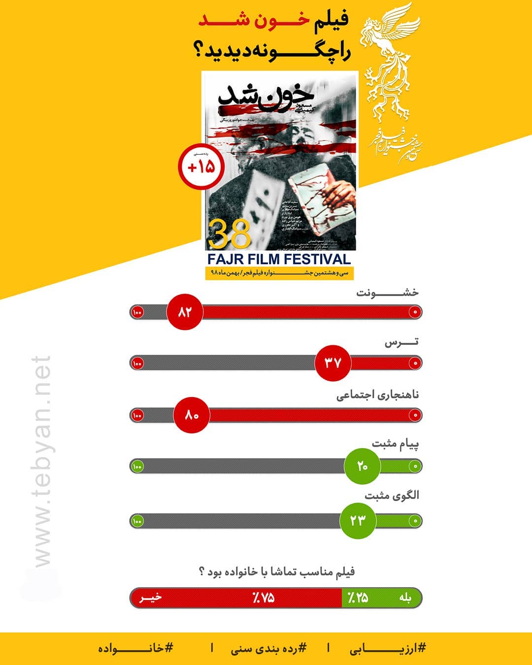 نظرسنجی کدومو از تماشاگران "خون شد" 📊خشونت : ۸۲ 📊ترس : ۳۷ 📊ناهنجاریهای اجتماعی : ۸۰ 📊پیام مثبت : ۲۰ 📊الگوی مثبت : ۲۳ ۲۵ درصد تماشاگران این فیلم را مناسب تماشا با خانواده دانسته اند. نظر شما درباره این فیلم چیست ؟ #کدومو #خانواده #ترس #خشونت#تربیت #آموزش