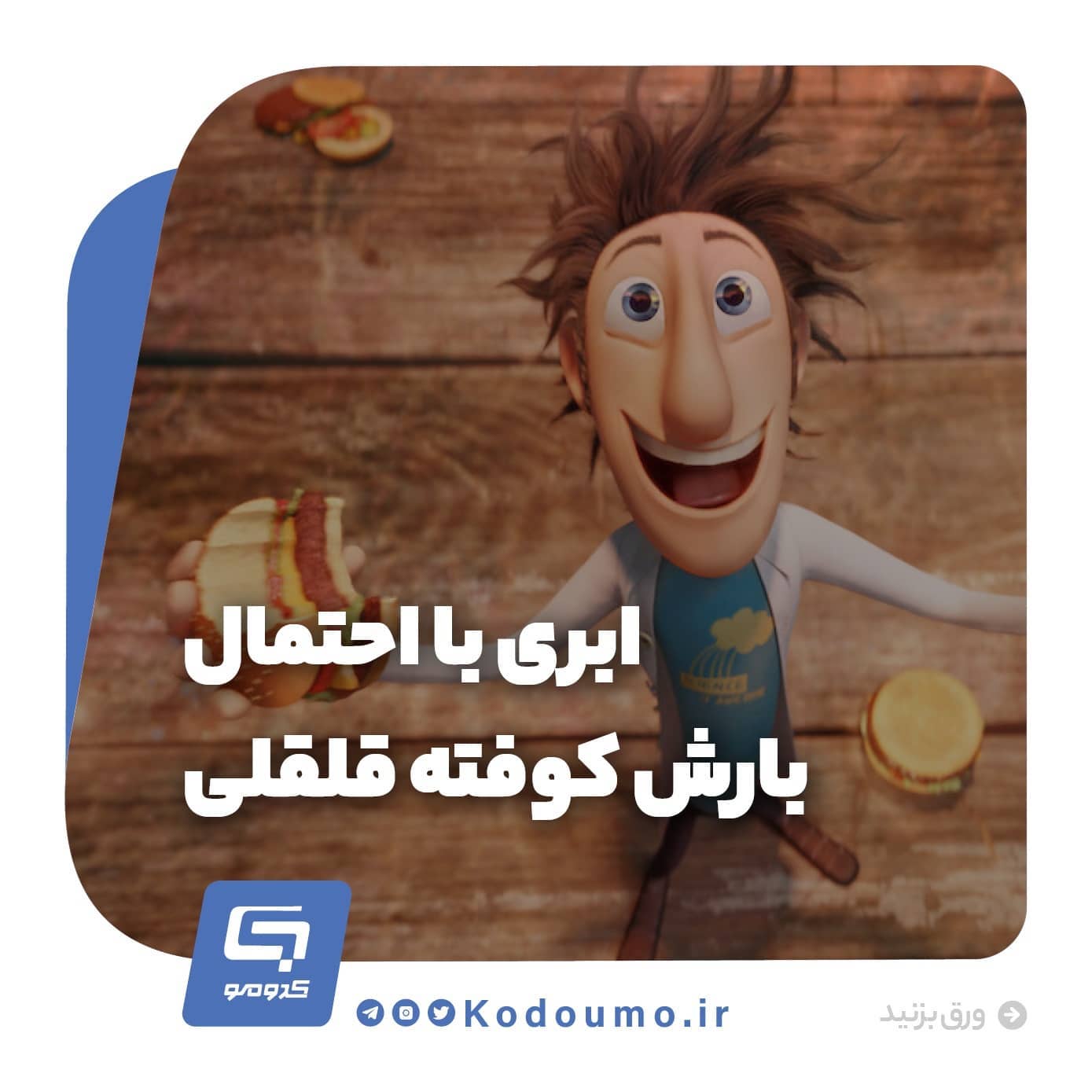 سلام مامان باباهای مهربون 📍انیمیشن ابری با احتمال بارش کوفته قلقلی ماجرای پسری است که آرزوی مخترع شدن دارد اما کسی جز خودش او را نابغه نمی داند. دیدن این انیمیشن میتواند کودکان را بخنداند، اهمیت تلاش، امید و کار تیمی را به آنها یاد دهد و صحنههای خطرناک بارش غذاهای غولپیکر، ممکن است باعث ترس آنها شود. 📍 کودکان در این انیمیشن پدران مهربانی را تماشا میکنند که به سبکهای مختلف پسرشان را دوست دارند و اهمیت خانواده و دوست را در ماجرای فلینت لاکوود متوجه میشوند. عنوان انگلیسی اثر: Cloudy with a Chance of Meatballs سال تولید: 2009 مدت زمان: 90 دقیقه کشور سازنده: امریکا کمپانی : سونی پیکچرز 🔗 کدومو؛ همپای خانوادهها 🔗 @kodoumo