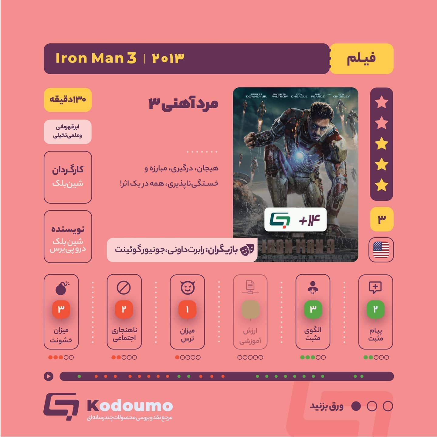 🎥 فیلم مرد آهنی ۳ 📍ماندارین، رئیس یه گروه تروریستیه که میخواد با گروگانگیری و آدمکشی به هدفاش برسه، مرد آهنی هم که اونو حریف قدرتمندی نمیبینه، به مبارزه دعوتش میکنه. 📍این اثر که در ژانر ابرقهرمانی و علمی ـ تخیلی ساخته شده شامل صحنههای درگیری فیزیکی، نمایش قتل و جنگه. ازطرفی شخصیتهای این اثر به دو گروه شخصیتهای مثبت و منفی تقسیم میشن. شخصیت ابرقهرمانی مرد آهنی و خشونت نمایشدادهشده در اثر میتونه مورد تقلید بچه ها قرار بگیره که میشه برای کنترل این اتفاق قبل و بعد از دیدن فیلم با آونها گفتگو کرد. 📌 بیشتر بدانید: yun.ir/ulcm77 🔗 کدومو؛ همپای خانوادهها @Kodoumo #کدومو #فیلم #والدین #تربیت #مرد_آهنی