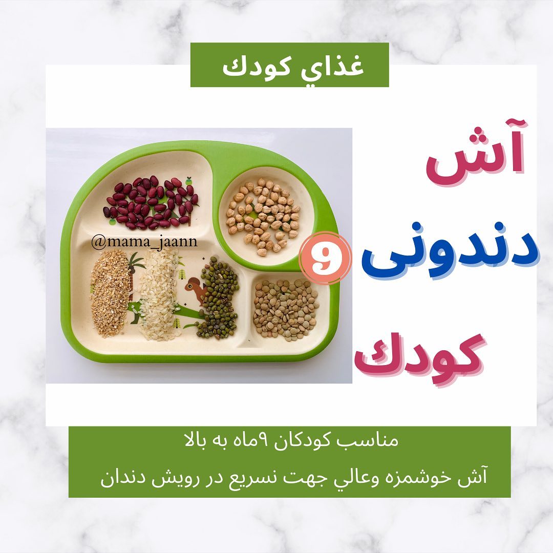 سلام چه حال و احوال؟؟ آش دندونی یکی از آش های قدیمی هست که واسه راحت تر دندان در آوردن کودک طبخ میکردند😍🥰 آش دندونی(+٩) عدس:١قاشق غذاخوری نخود:١قاشق غذاخوری ماش:١قاشق غذاخوری لوبیا:١ قاشق غذاخوری برنج:١/۵قاشق غذاخوری بلغور گندم:١قاشق غذاخوری بلغور جو:١قاشق غذاخوری پیاز:١عدد 1️⃣حتما حبوبات رو از٢۴ساعت قبل با یک تکه خیار خیس کنید و چند سری آب ش رو عوض کنید تا کامل نفخ ش از بین بره. بعد با یک و نیم لیوان آب بزارید تا خوب بپزه.✅ 2️⃣برنج،جو،گندم رو بزارید بپزه و خوب نرم بشه ✅ 3️⃣در ظرفی کوچک پیاز خرد شده رو سرخ کنید و کمی زردچوبه و نعنا بهش بزنید و به مخلوط برنج و حبوبات اضافه کنید.✅ ✅نکته: حتما حتما حبوبات روبا پشت قاشق له کنید و بعد به کودکان زیر ۳سال بدهید.❌⛔️ میتونید در این آش از گوشت گوسفند ریش ریش هم استفاده کنید.🥩 میتونید از قلم یا عصاره قلم برای مقوی تر شدن غذای کودک استفاده کنید.🥘 اگر از اکسپلور یا هشتک پست ما رو میبینی خوشحال میشم به جمع ما بپیوندی😍😍😍 @mama_jaann @mama_jaann #تغذیه_کودک #تغذیه_مناسب #تغذیه_کودکان #غذای_کودک #غذای_کمکی_کودک #سوپ_کودک #کودک_خلاق #کودک_باهوش #وزنگیری_کودک #رشد_کودک #تکامل_کودک #دندان_کودک