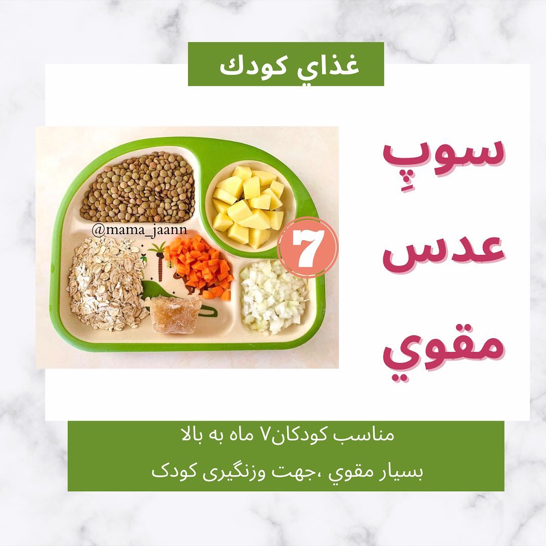 سلام ظهر جمعه تون بخير و خوشي😍👋🏻 اين هم ي سوپ عدس خوشمزه و فوق مقوي واسه كوچولوهاي نازنين تون🥰🥰 اول لا..يك و س.ي.و كن تا بريم واسه دستور پختش🥳🥳 سوپ عدس (+۷) سیب زمینی:نصف عدد كوك هویج:نصف عدد كوچك پیاز:١عدد كوچك جو دوسرپرک:١/٥قاشق غذاخوري عدس:١قاشق غذاخوري عصاره قلم:١عدد تمام مواد رو به جو با دو لیوان آب گذاشتم نيم پز بشه و بعد بهش جو رو اضافه كردم و گذاشتم خوب بپزه و لعاب بندازه سیب زمینی و هویج رو با پشت قاشق له کردم و دادم به پسرم😍 این غذا خوشمزه و مقوی با چند قطره لیمو ترش عالی میشه 😋😋نوش جون کوچولوهاتون🌹🌹😘😘 اگر از اكسپلور و هشتك پست ما رو ميبيني به جمع٦٠هزار نفره ما بپيوند😍😍🤩🤩 @mama_jaann @mama_jaann @mama_jaann #غذای_کودک#تغذیه_کودک #غذای_خانگی #خوشمزه_طوری #مادر #عدس #رشد_کودک #تغذیه_سالم #مهرباني #کودک_باهوش #نوزادان_زودرس#غذای_مقوی_کودک