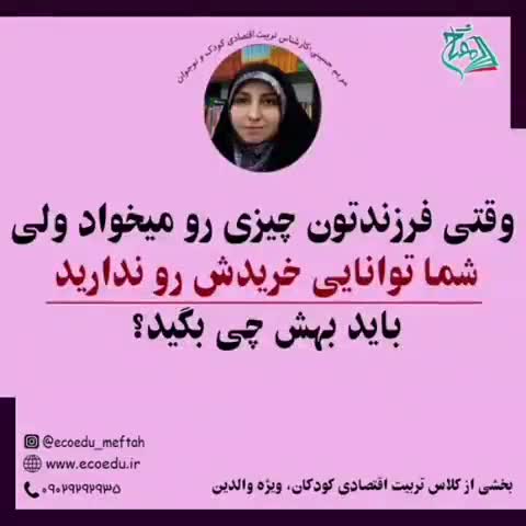 ⚠️ وقتی فرزندتون چیزی رو می خواد ولی شما توانایی خریدش را ندارید باید بهش چی بگید؟ . اصلا در چنین شرایطی نگویید پول ندارم! بلکه بگویید: فیلم را حتما تا اخر ببینید تا جوابش را بگیرید✌ . اگر مفید بود برای دیگران هم ارسال کنید🙏 . مدرس: سرکار خانم مریم حسینی؛ کارشناس ارشد تربیت اقتصادیکودک و نوجوان، مدیر موسسه مفتاح و نویسنده چندین کتاب در زمینه تربیت اقتصادی کودک و نوجوان @hossaini.maryam . 👈👈👈سایر ارگان ها در صورت تمایل برای برگزاری کلاس تربیت اقتصادی والدین و کودکان به دایرکت پیام داده یا با شماره زیر تماس بگیرند. 090 29 29 29 35 ⚫مفتاح؛ موسسه فرهنگی هنری تربیت اقتصاد حکیم @ecoedu_meftah @ecoedu_meftah @ecoedu_meftah