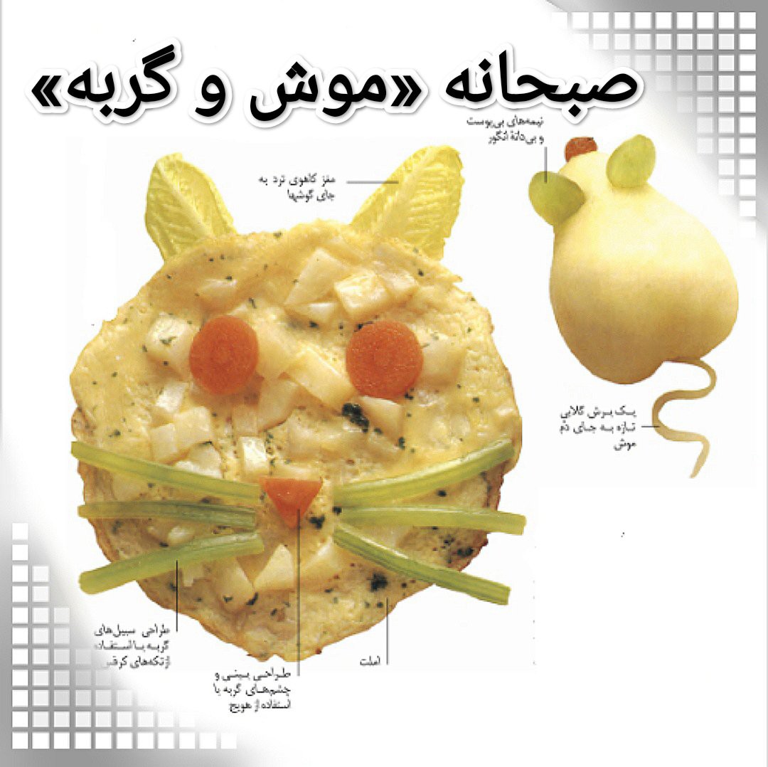 اگر کودک شما گربهای را از نزدیک دیده باشد و یا داستان موش و گربه را شنیده باشد، این شکلها برایش جالب خواهند بود. صورت گربه، یک املت ساده تخممرغ با قطعات کوچک سیبزمینی پختهشده و جعفری تازه است. جعفری سرشار از #کلسیم، #آهن و #ویتامین است و میتوانید از خرد شده آن به عنوان یک چاشنی و نیز برای افزودن رنگ به انواع #غذاها استفاده کنید. برای تزئین املت از هر سبزیای که دم دست دارید، استفاده کنید و با استفاده از انواع #سبزیها، پنیر رنده شده یا جوانههای لوبیا به طعم و ارزش غذایی آن بیفزایید. یک گلابی رسیده را پوست بکنید. آن را از وسط نصف کنید و هستهاش را درآورید. حالا یک انگور پوستکنده و بیدانه را نصف کنید و به جای گوش، در شکافها قرار دهید. یک برش گلابی هم به جای دم موش بگذارید و به جای بینی آن از کشمش بیدانه خیس خورده استفاده کنید. طرز تهیه "املت گربه":https://www.bamano.life/post/35268 را ببینید. منبع: اولین غذاها #صبحانه #تزیین_غذا