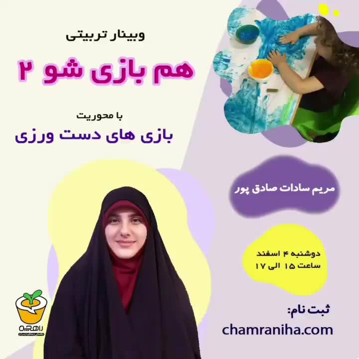این وبینار مخصوص مادرها و مربی هایی هست که میخوان یه هم بازی حرفه ای باشن‼️ . چطور می تونیم هوش بچه های زیر ۷ سال رو تقویت کنیم؟🤔 . چه فعالیت هایی، یادگیری و هماهنگی چشم دست و مغز بچه ها رو افزایش میده؟🤗 . دست ورزی چطور باعث اصلاح اختلالات رفتاری می شه؟🤯 . دست ورزی به چه فعالیت هایی گفته میشه؟🧐 . میدونید بازی های دست ورزی چه خواصی داره؟😊 . دوشنبه ۴ اسفند ساعت ۱۵ الی ۱۷ . فقط تا فردا فرصت دارید با ۲۰٪ تخفیف ثبت نام کنید😱 Chamraniha.com . ⭕همین حالا این پست رو سیو کنید و برای مامان ها و مربی ها بفرستید😉 . #وبینار_تربیتی#هم_بازی_شو #والدین_آگاه #مربی #بازی_با_کودک #بازی #کارگاه_مجازی #دست_ورزی_کودک