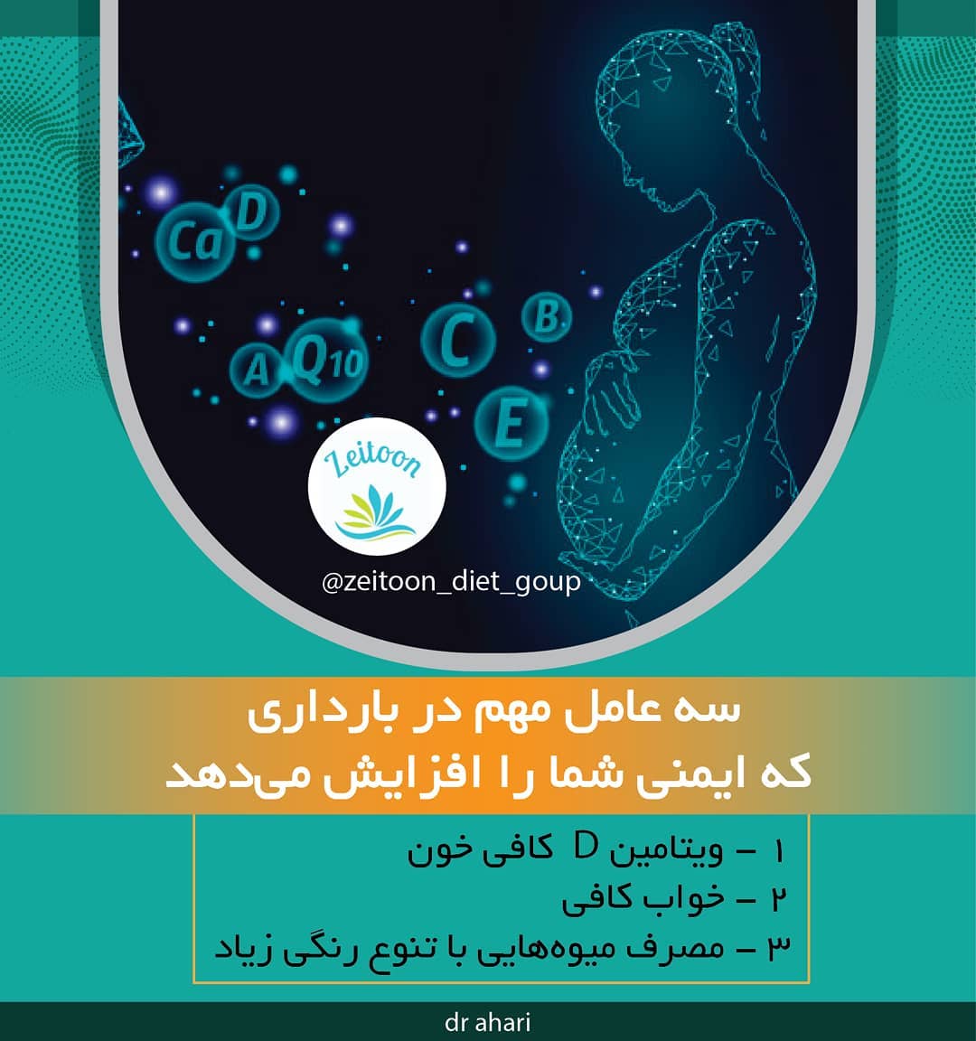 ممنون که با ❤ حمایتمون می کنید😍 و اما ماجرا اینه که 😀 ✉✉✉نگهداشتن ایمنی بدن در سطح بالا، تو دوره بارداری خیلی مهمه🤩 برای این کار پیشنهادهای مختلفی هست اما مهمترین راه اینه که : ✔ حتما سطح ویتامینD خون شما نرمال باشه یعنی کمبودی چیزی از بابت ویتامین Dنداشته باشید😉 تشخیصشم راحته😗 یه توک پا تشریف میبرید آزمایشگاه و یه آزمایش ویتامینD سرم میدید معلوم میشه که کمبود دارین یا نه🤔 اگر قبل از شروع بارداریه که بهتر، شروع می کنید به مصرف هفته ای یه قرص ویتامین دی (البته با مشورت دکترتون) اگر در حین بارداریه😐 اول میرید پیش دکترتون تا تکلیف شما و ویتامینD رو مشخص کنه😄 ✔دومین راه خواب کافیه میدونم که مادرای باردار شبها خیلی بد میخوابن😥 و فقط یه مادر میدونه بی خوابی بارداری یعنی چی😔😔😔 ولی با 📝📝📝📝راهکارهایی که همکارای روانشناسمون میگن، میتونین خواب راحت و کافی داشته باشین 😀 تا ایمنی بدنتون بیشتر بشه😍 ✔راه سوم و خوشمزه ترین راه خوردن میوه های رنگی متنوع هست🍑🍌🍓🍋🍊🍅🍏🍍🍎🍈🍇 بعضی مامانا میگن من فقط سیب میخورم یا فقط موز میخورم ما توصیه میکنیم اینکارو نکنن یه روز سیب🍏 یه روز نارنگی🍊 یه روز انار🍅 یه روز خرمالو🍊 و .🍐🥑🥝🍍🍅🍓🍇 . اگه تو یه روز ۳ جور میوه هم بود که دیگه بهتر😄 مراقب خودتون باشید😘😘😘 تو خونوادتون ، یا دوستاتون هستن مامانای بارداری که بی خوابی دارن؟ بفرستید براش، کارش رامیافته، ثوابشم به شما میرسه😄😄😄😘😘😘 در مورد بهتر خوابیدن شما چه راهی بنظرتون میرسه؟ بهمون بگید🙏🙏🙏 #تغذیه_بارداری_گروه_مادران #تغذیه_تعیین_جنسیت #رژیم_باردارے #رژیم_بارداری_شیردهی #تغذیه_باروری_مردان #تغذیه_باروری_زنان #متخصص_تغذیه_خوب #متخصص_تغذیه_بارداری#رژیم_بارداری_اهری